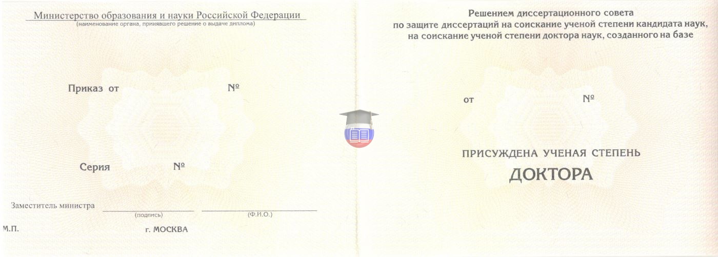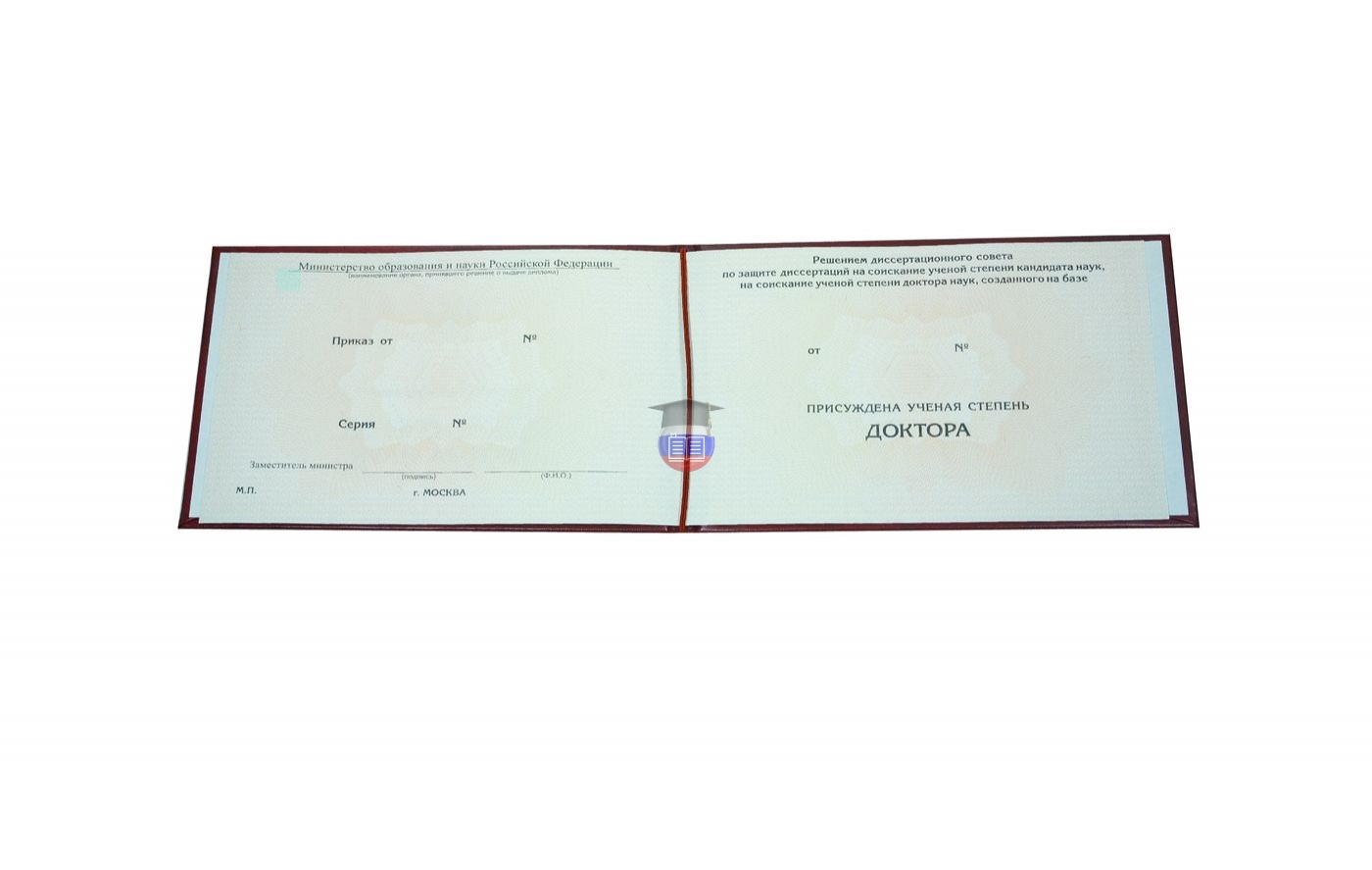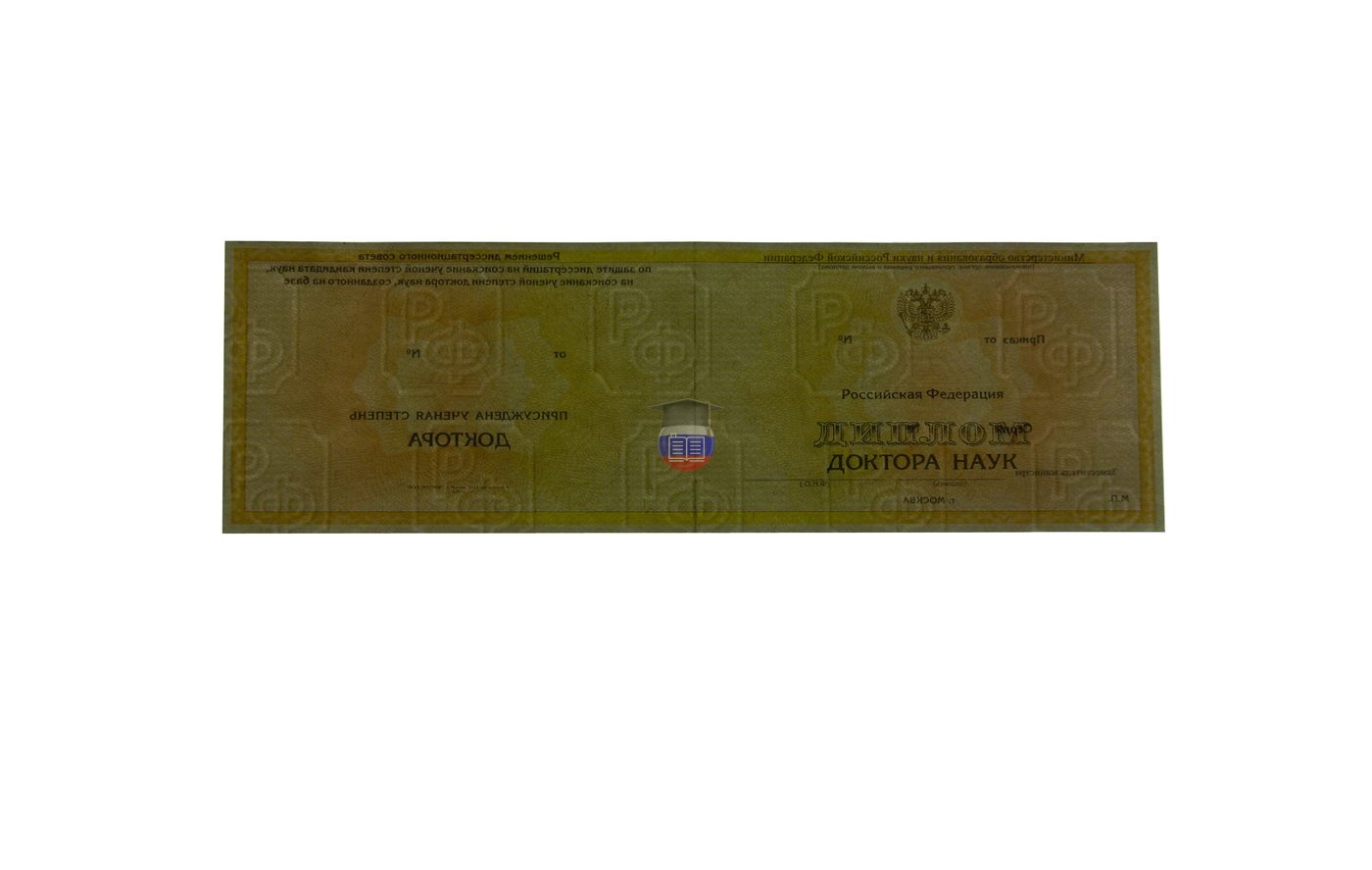 Диплом выдается учёному, успешно защитившему докторскую диссертацию и публикующему авторские работы в журналах. Корочки вручаются в течение двух месяцев со дня издания приказа. Бланк подписывается руководителем учреждения, в котором проходила защита диссертации. В правой части оборотной стороны — название диссертационного совета, номер и дата решения. Заполнение — на принтере или черной тушью каллиграфическим почерком.