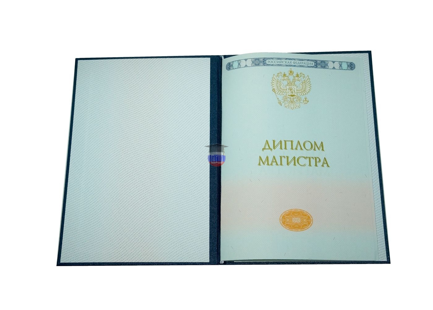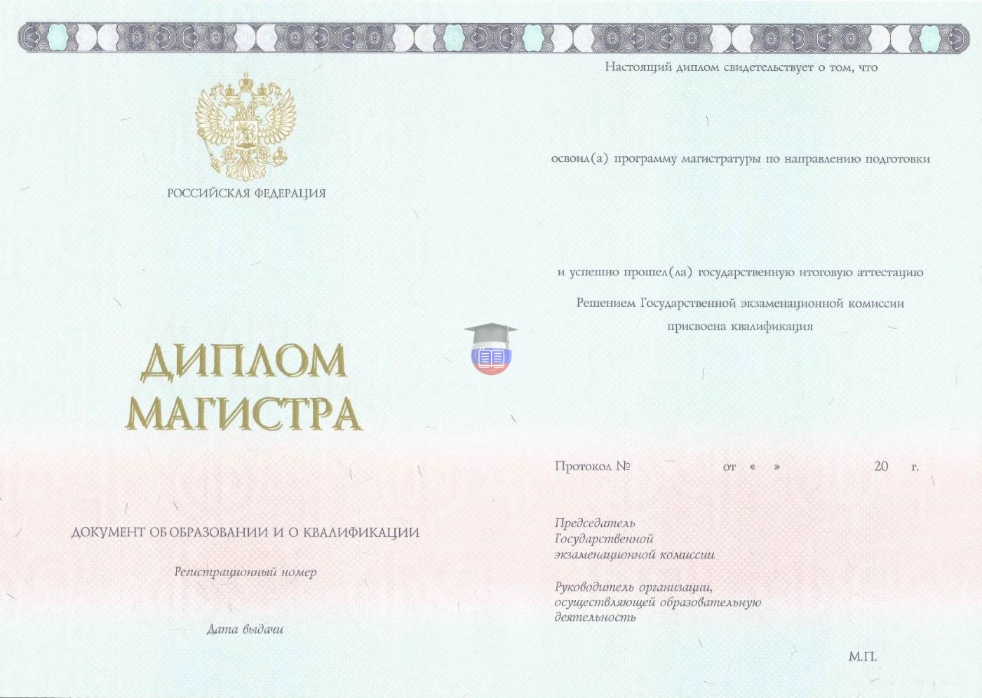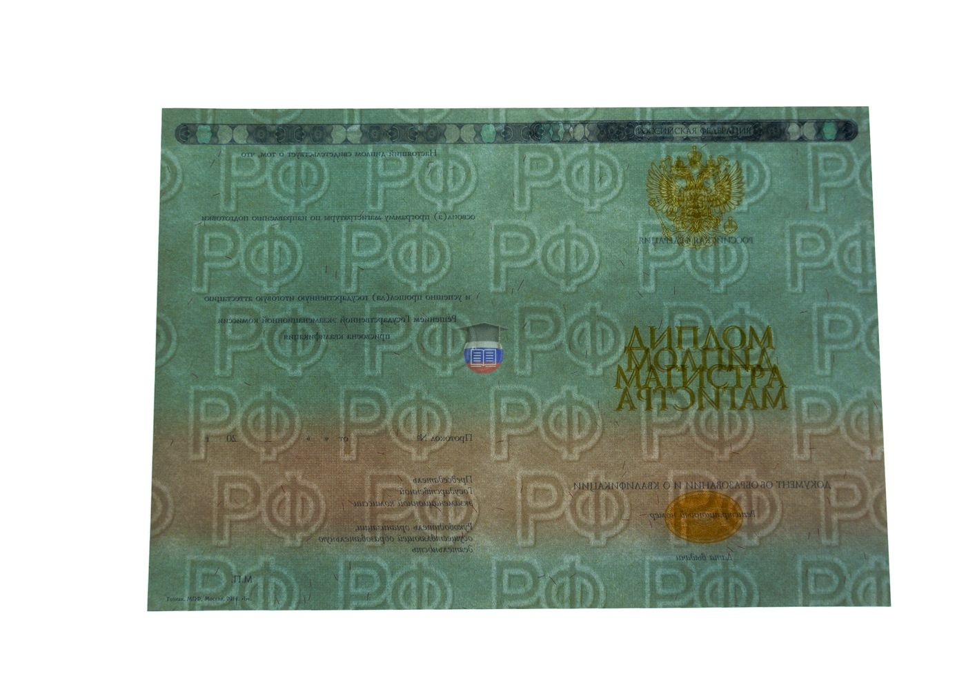 Диплом магистра напечатан на бланке государственного образца «Гознак». Документ включает приложение и синюю корочку. Защита бланка — специальные водяные знаки, микротекст, светоотражающие элементы, герб России, плавный цветовой переход. Бумага с подлинной печатью учебного учреждения заполняется согласно его уставу.