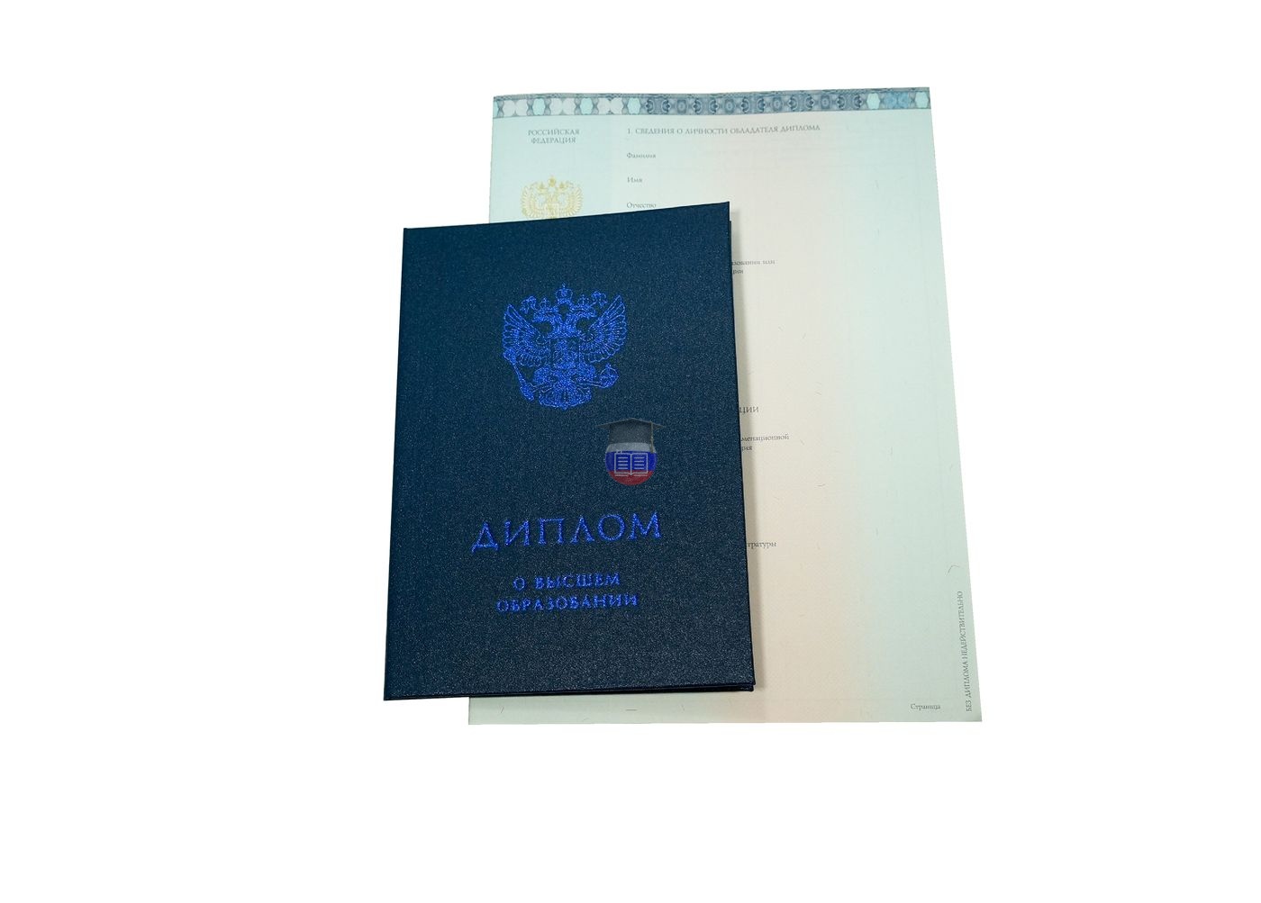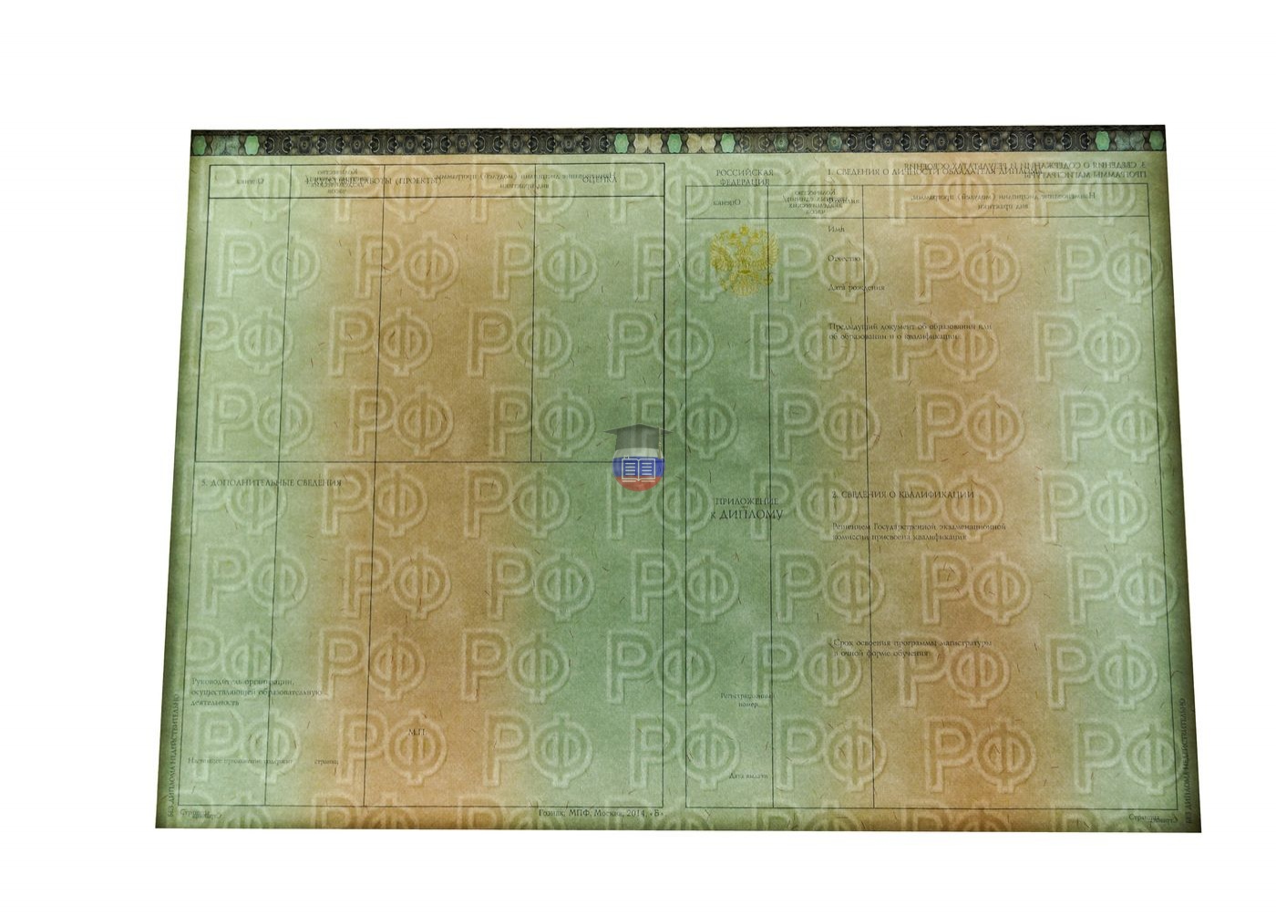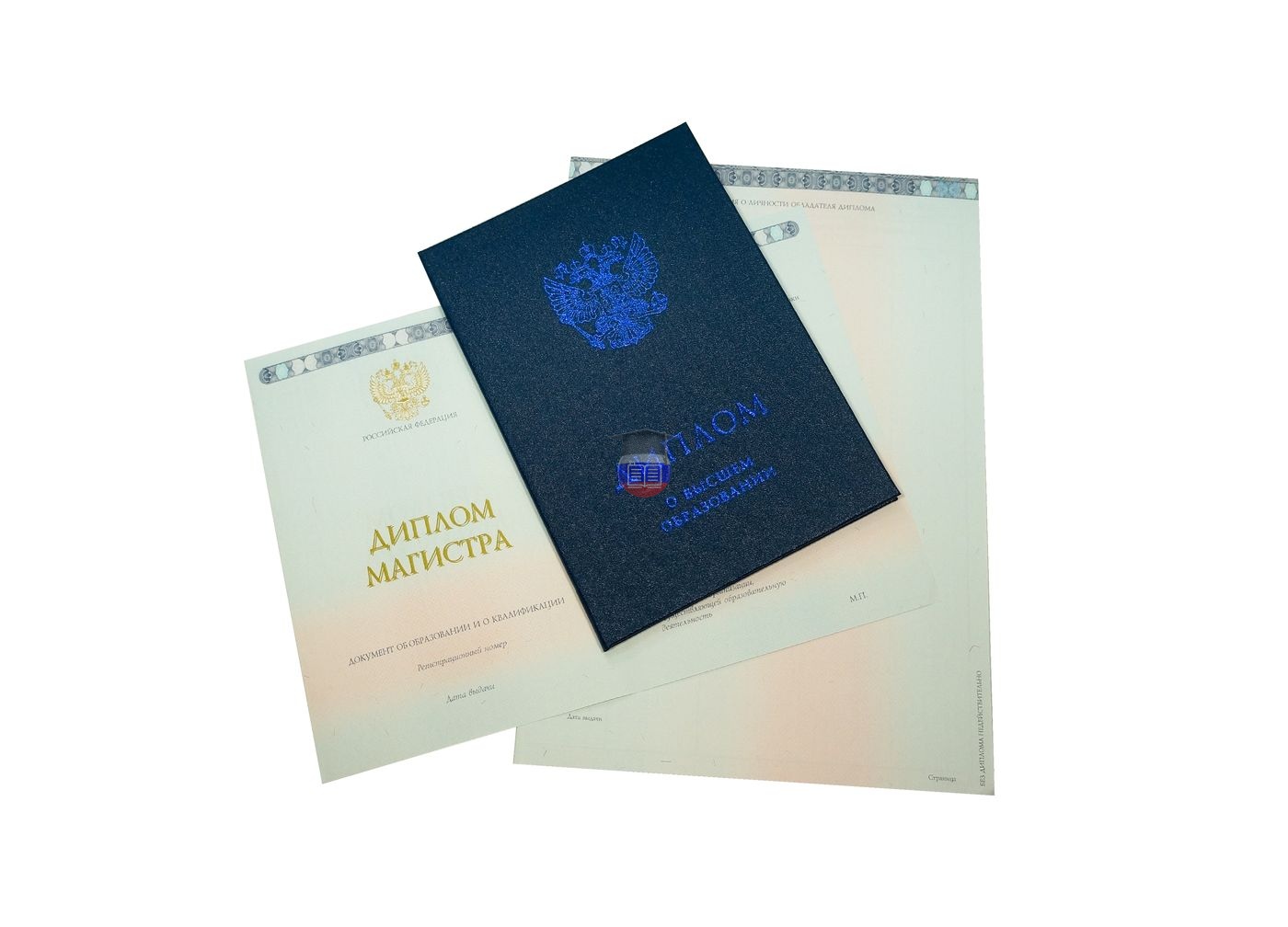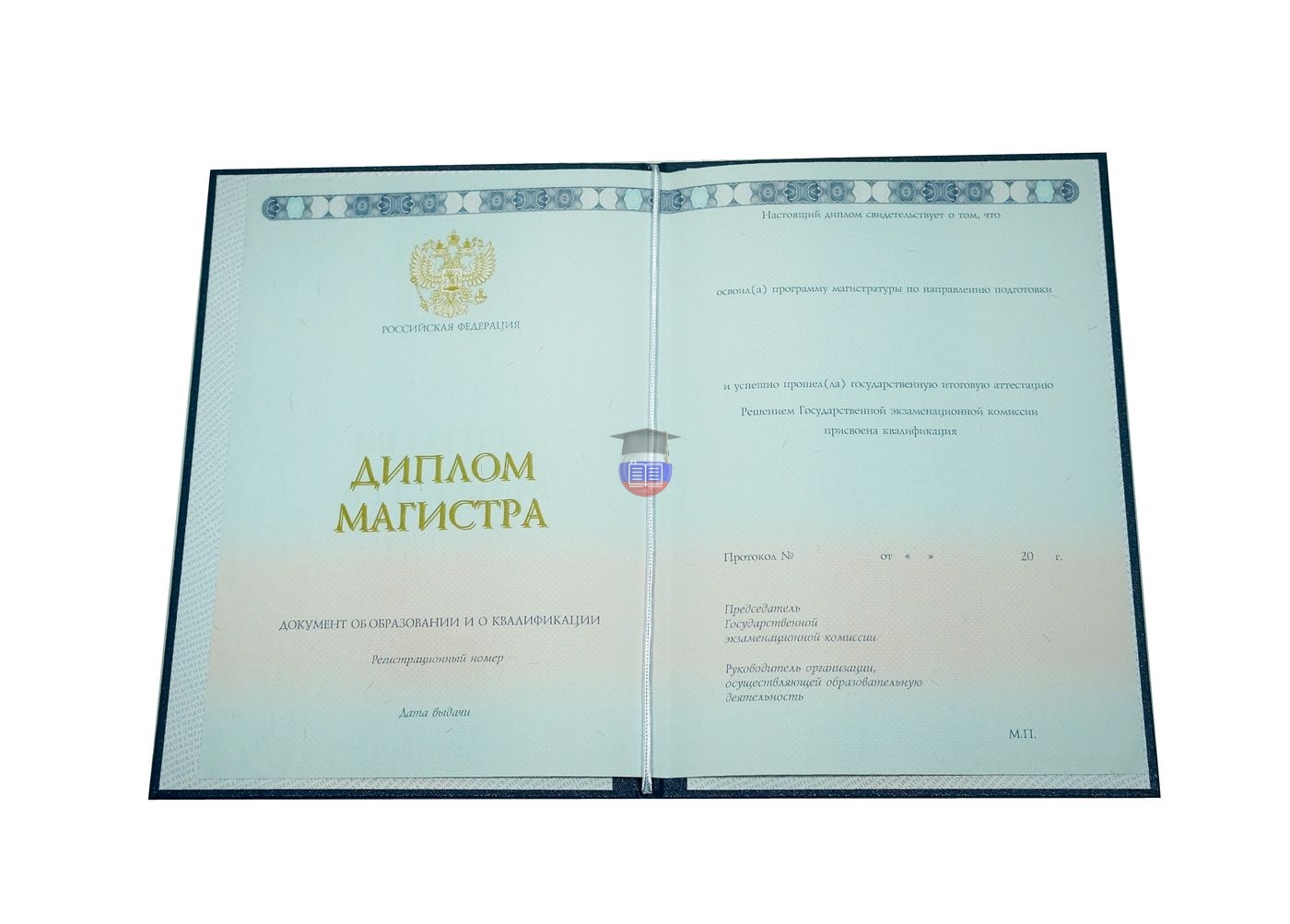 Диплом магистра напечатан на бланке государственного образца «Гознак». Документ включает приложение и синюю корочку. Защита бланка — специальные водяные знаки, микротекст, светоотражающие элементы, герб России, плавный цветовой переход. Бумага с подлинной печатью учебного учреждения заполняется согласно его уставу.