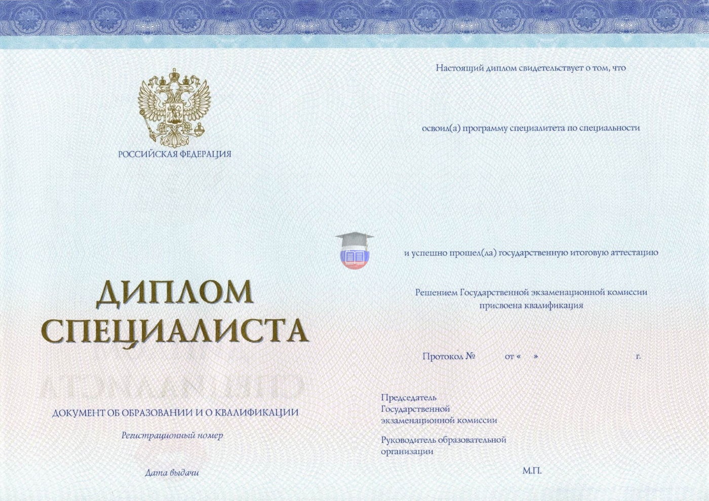 Диплом специалиста — документ о присвоении квалификации после прохождения специальной программы обучения. Её особенности — узкий профиль, сочетание углубленной теории с практикой, обучение в течение 5-5,5 лет. В комплекте — бланк установленного образца, заполненный по правилам Минобразования и науки РФ. Степени защиты — голографические знаки, водяной оттиск, узор из непрерывных линий, мокрая печать вуза, регистрационный номер соответствующий региону выдачи.