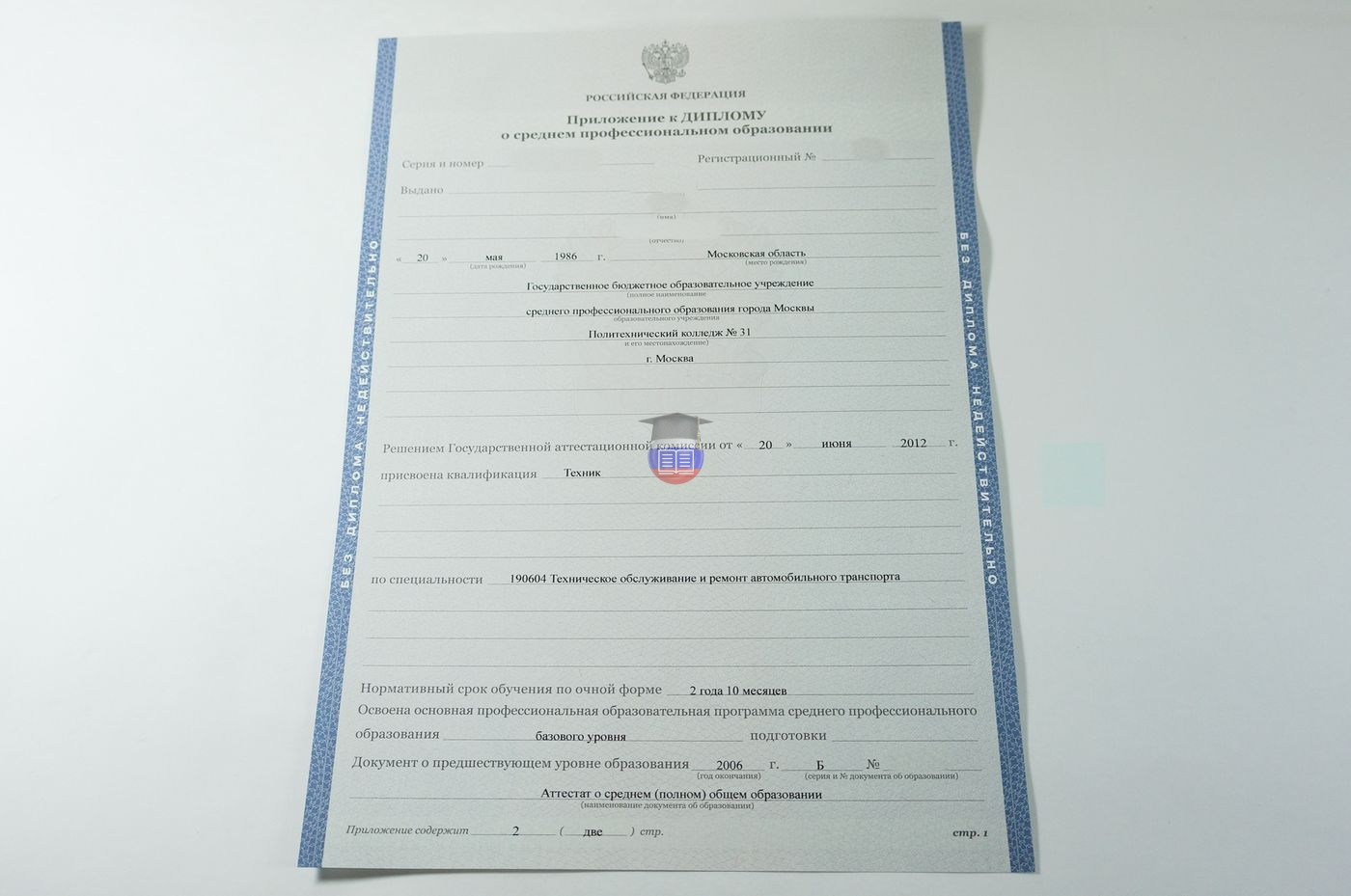 Диплом о среднем образовании с 2008 по 2010 годы